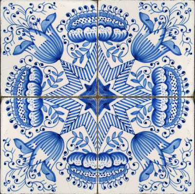 azulejos similares aos usados nas faixas largas verticais e horizontais, como visto nas fotos acima, do padrão "Tulp en Ster" (Tulipa e Estrela), encontrado em um catálogo online de azulejos antigos holandeses. |