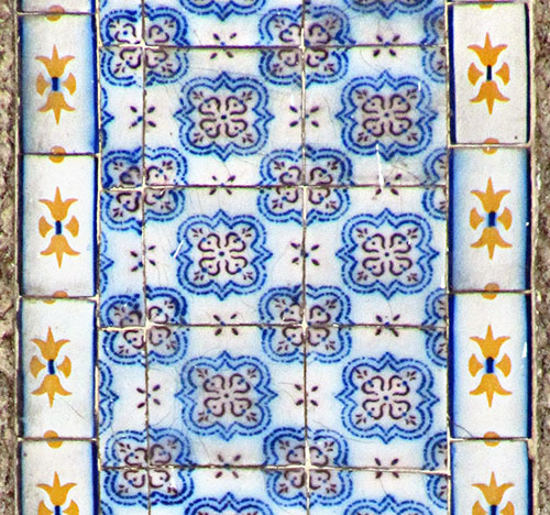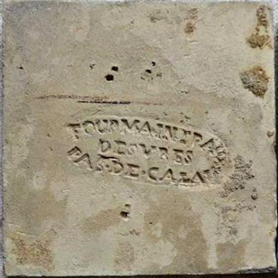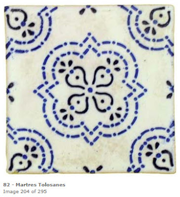 Tanto o azulejo de padrão quanto a cercadura constam no catálogo da enorme coleção de azulejos franceses de Benoît Faÿ (França). Para o azulejo de padrão há, neste catálogo, a possibilidade de ao menos 2 origens: Fourmaintraux Hornoy, em Desvres (a que julgo mais provável, uma vez que há uma enorme quantidade de azulejos da região de Desvres no Rio de Janeiro, bem como o aspecto de "borrão" dos azulejos no imóvel e no catálogo) e Martres Tolosane.