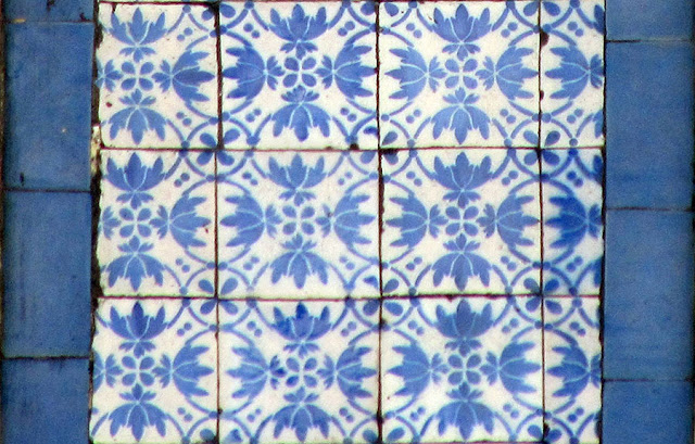 Nas duas fotos seguintes podemos ver melhor o azulejo de padrão usado na fachada. Ao invés de uma cercadura desenhada, usaram apenas azulejos azuis lisos.