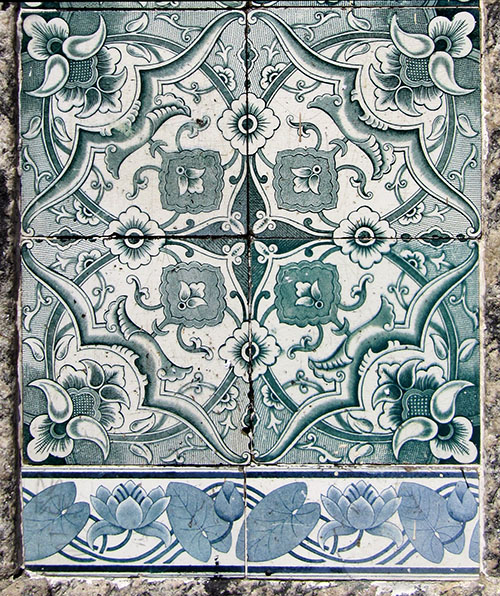 A identificação dos azulejos antigos ainda encontrados no Rio de Janeiro é sempre lenta e gradual. Há quase 2 anos fiz esta postagem [>>] sobre este portão de 1890, com 2 padrões de azulejos, cercadura e telhões pintados, mas nada pude dizer sobre os azulejos.